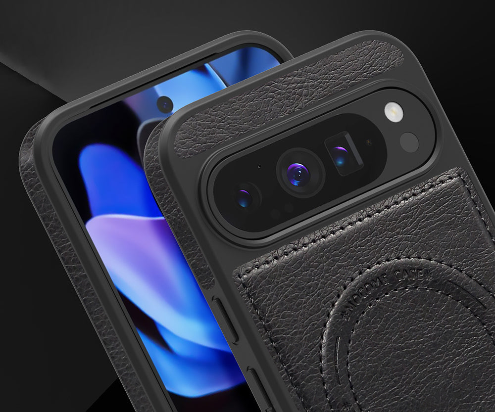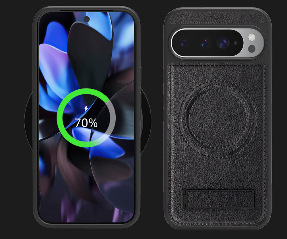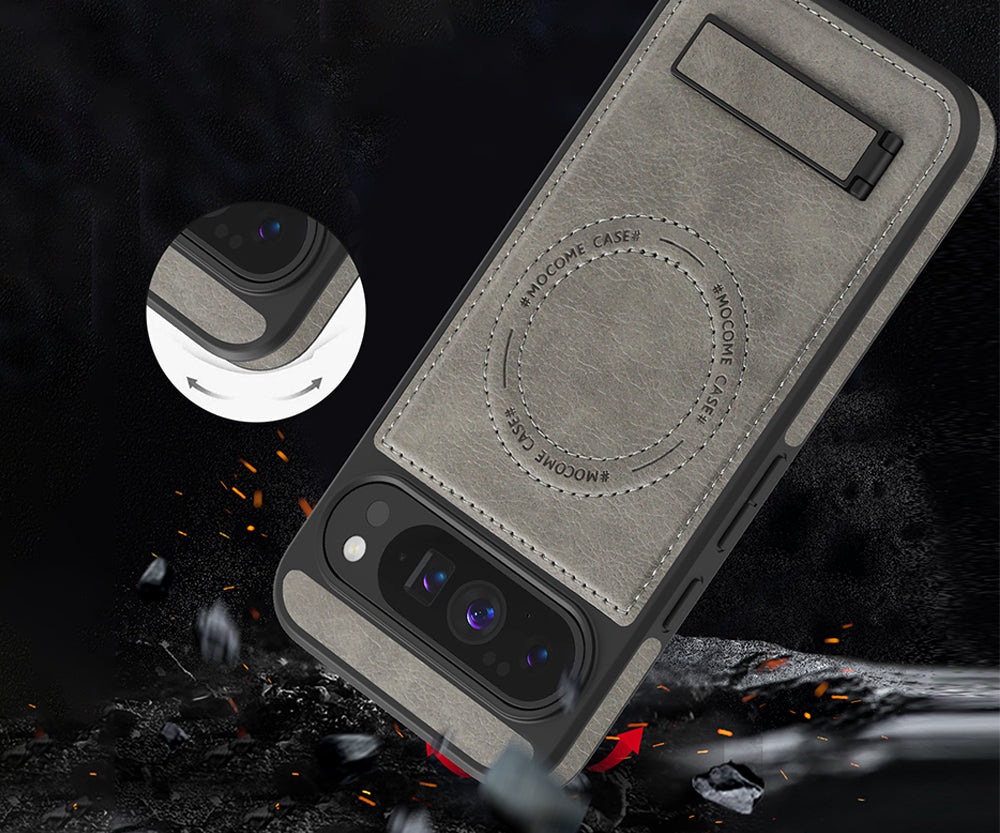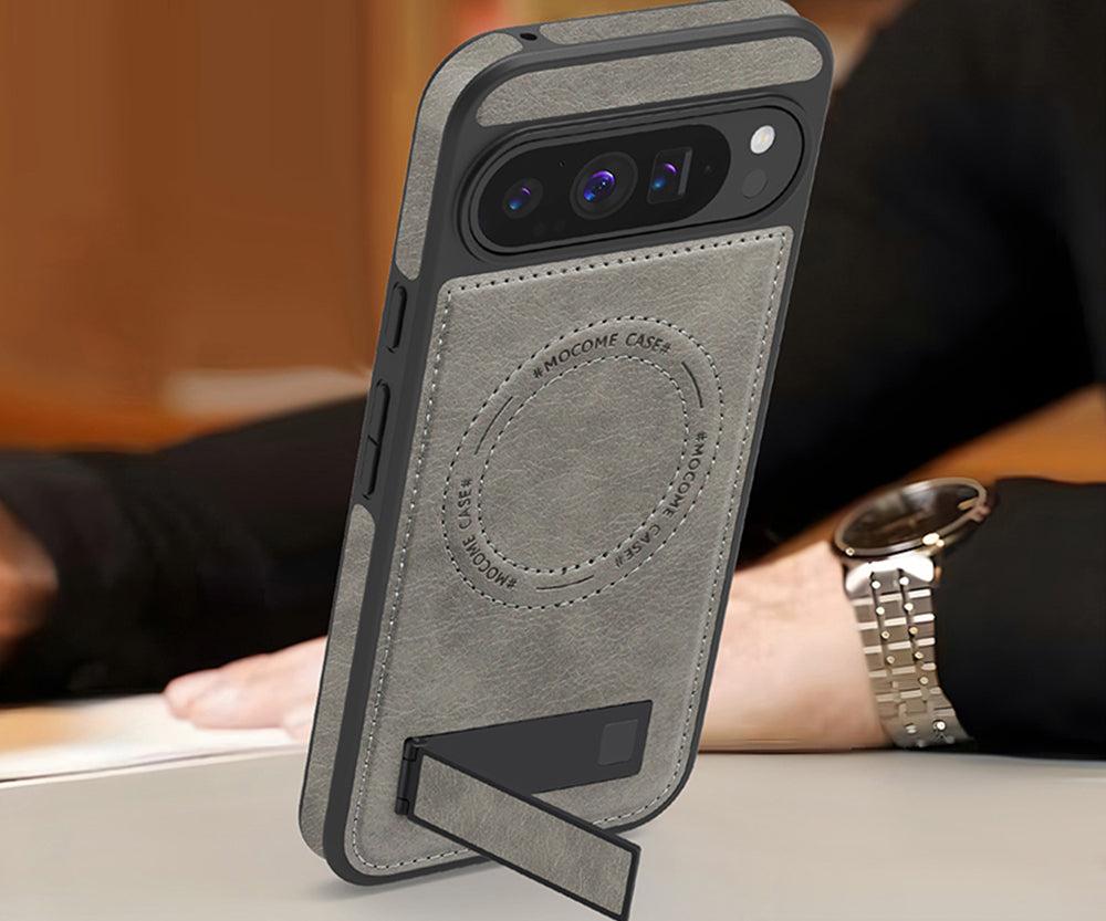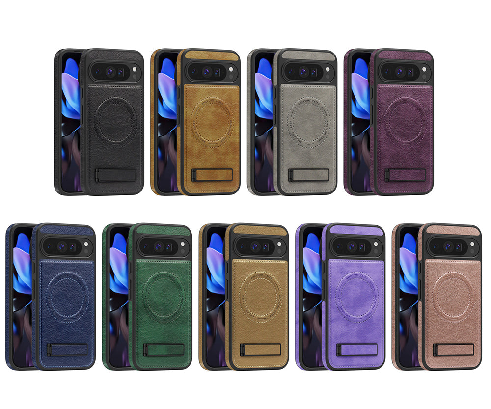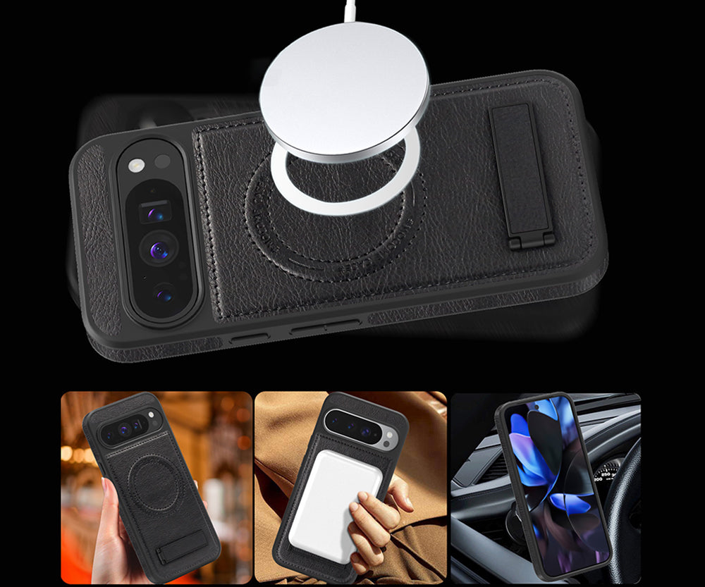 Premium leather case for Google Pixel 10 with integrated MagSafe magnets for wireless charging compatibility. Features a folding stand for hands-free viewing. Combines luxury aesthetics with reliable device protection.