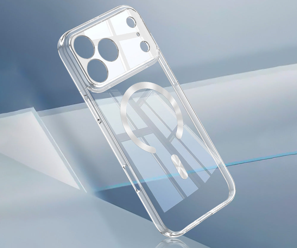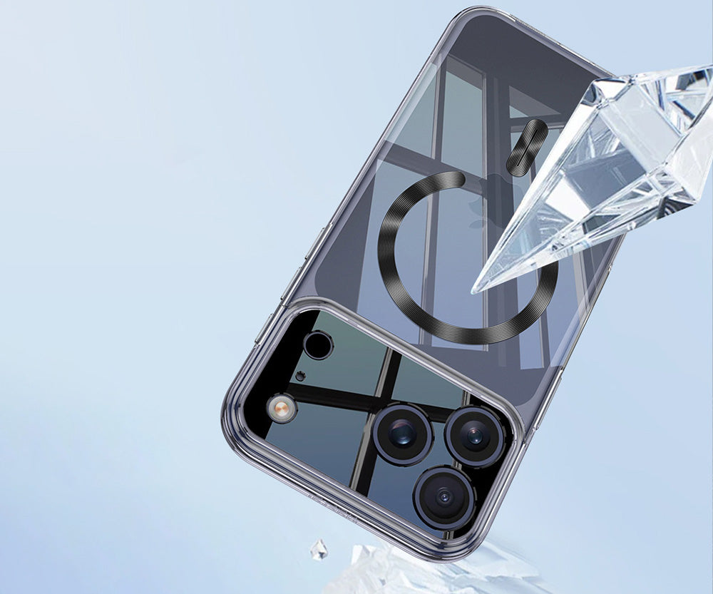This clear acrylic case features an anti-fingerprint coating and corner air pockets for protection. Its contrast stitching aids easy handling, while built-in magnets enhance wireless charging efficiency.