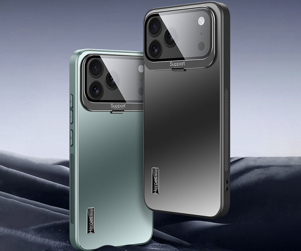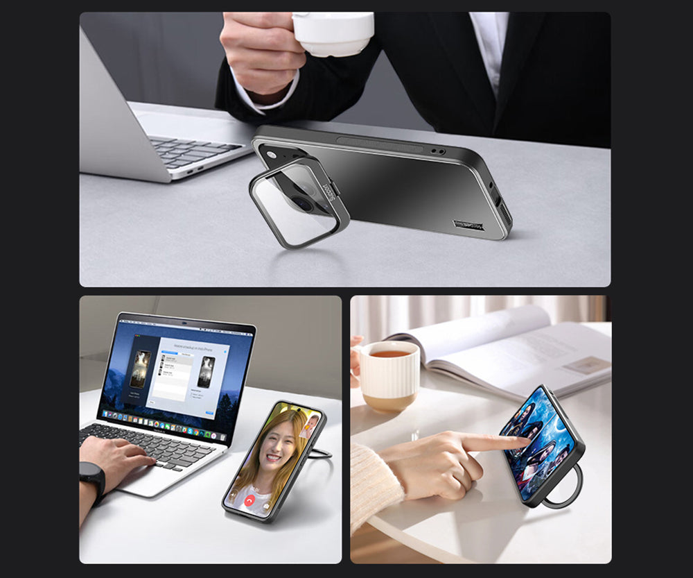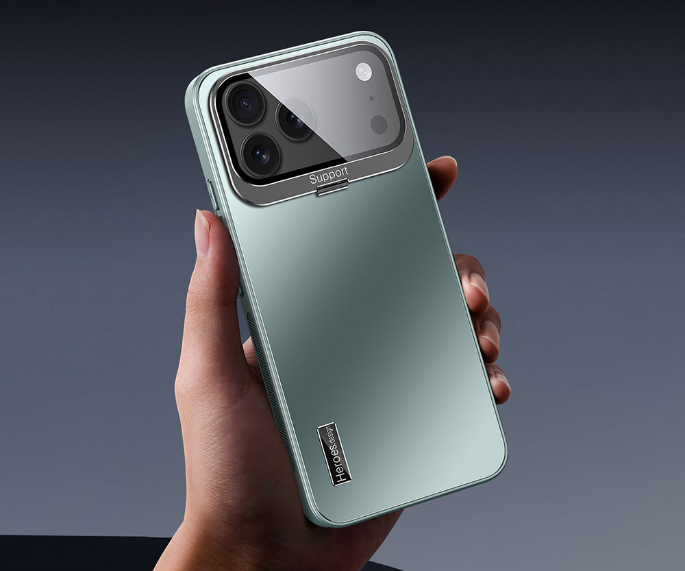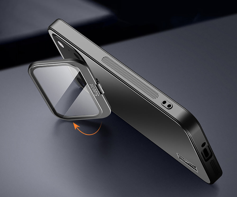 This frosted case features a thin metal matte back with an anti-fingerprint coating for cleanliness and strong drop protection. Its rugged design absorbs impact and resists wear. The metal lens ring doubles as a phone holder, enhancing lens safety.