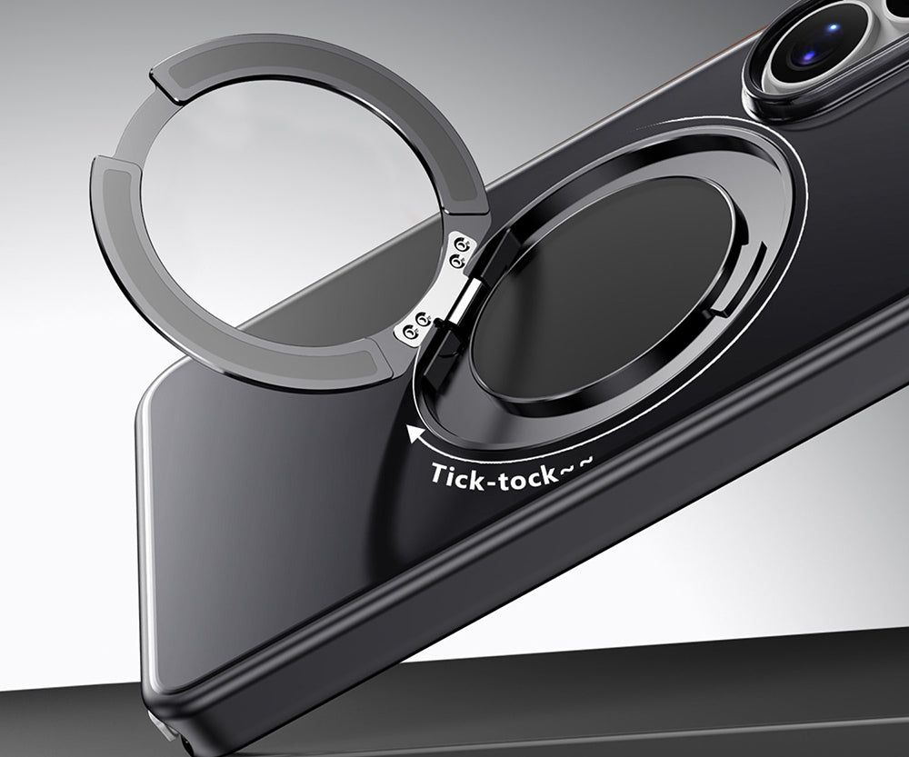 Ring buckle design for secure finger grip and hands-free entertainment with rotational and foldable bracket functionality.